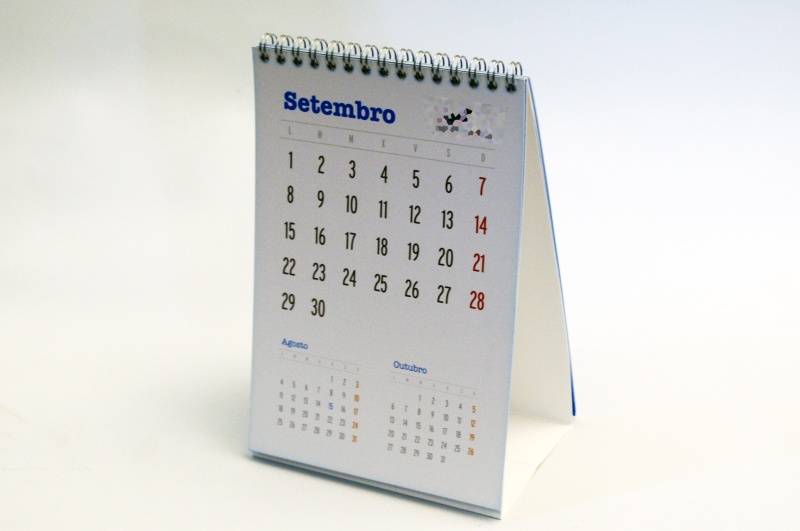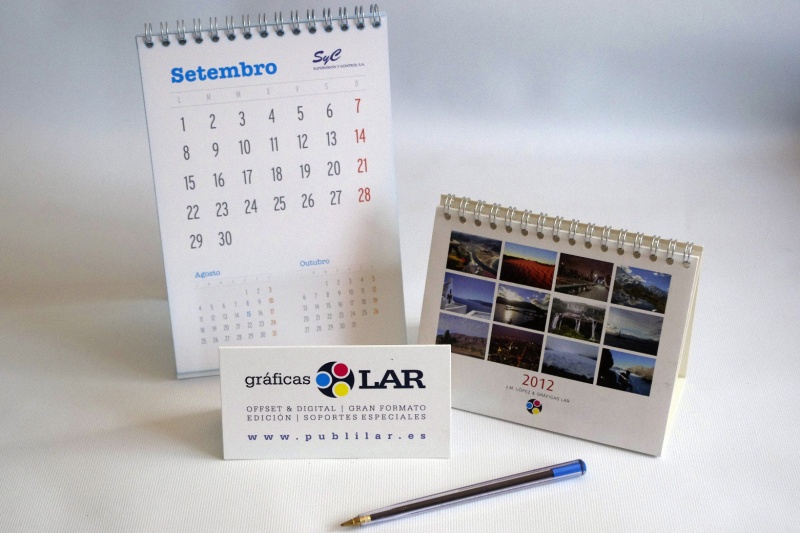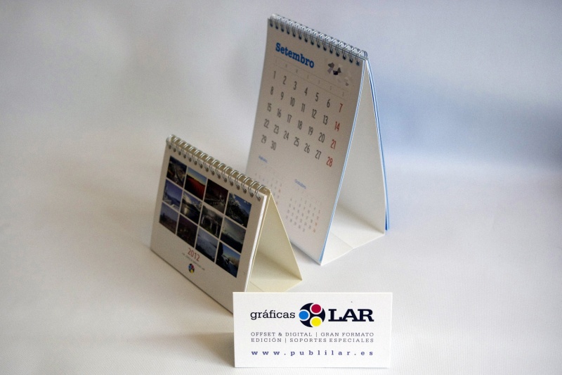 Generalmente formado por 12 láminas más portada. Opción de incluir foto y mes en una misma lámina para reducir a 6 láminas por calendario.